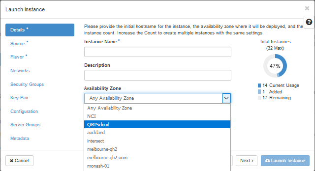 The Nectar Cloud is organised in Availability Zones, that are hosted by the participating institutions. An availability zone is a virtual area in the cloud where your VM will reside. In many cloud usage scenarios you won't need to worry about these: the Nectar software will select a suitable Availability Zone for you when you launch your VM. In certain other scenarios, however, you have to select the AZ that is right for your purpose.