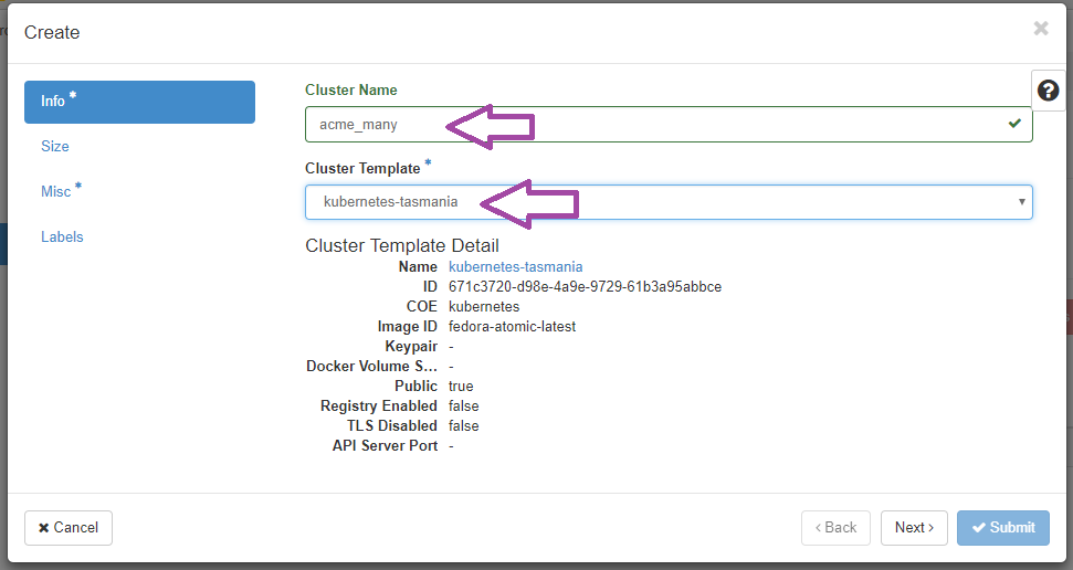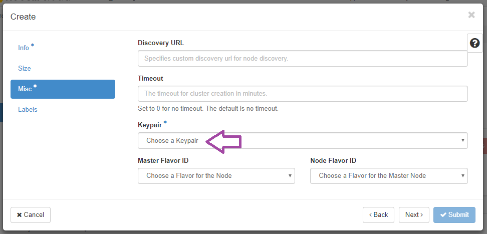 Choose the template that you want your cluster to be in. - On the Misc tab, make sure you select your Keypair.