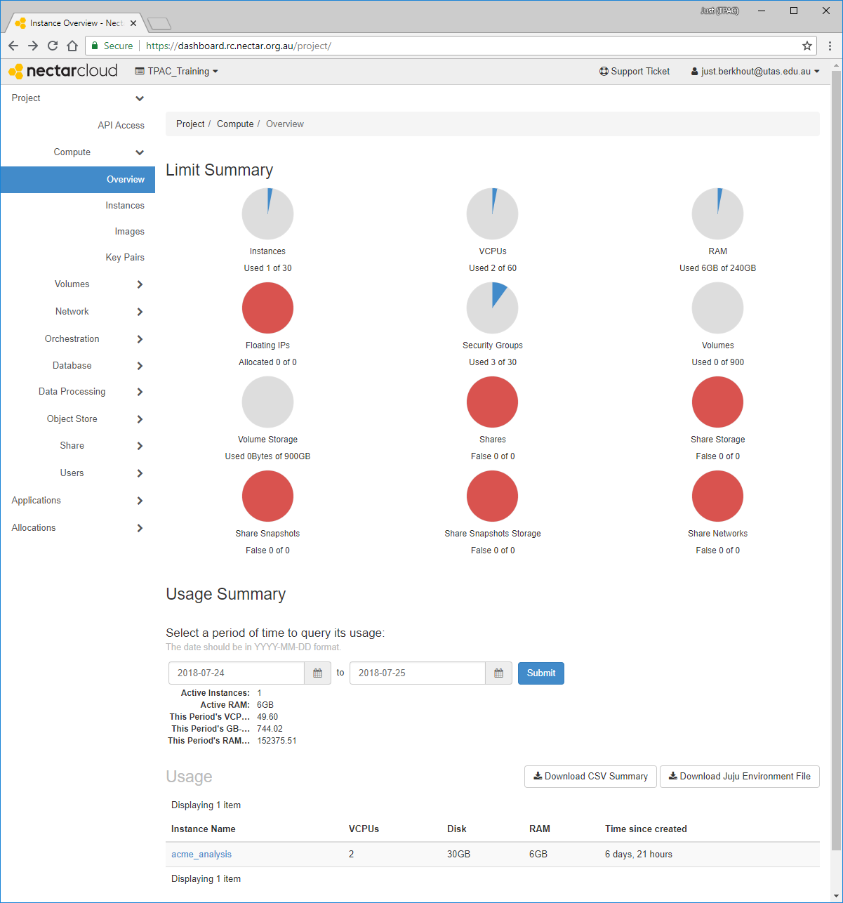 Nectar has released a new version of the Nectar Research Cloud dashboard. The Nectar Research Cloud dashboard update includes many usability improvements, a slightly updated look and feel and support for additional services while ensuring the Nectar Research Cloud aligns with recent versions of Openstack. Your Project Overview page has a new look, and the navigation panel on the left hand side has been rearranged. The Launch Instance dialog and the way Images are organised have been changed considerably.