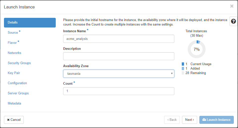 The Launch Instance Dialog, the tabbed window that used to launch instances, is now presented as a Wizard. You can still access the Launch Instance Dialog from the familiar locations on the Instances page and the Images page. The wizard format makes it much harder to forget to select your key pair, and provides a unified way for searching, browsing and choosing an image, flavor, key and security groups.