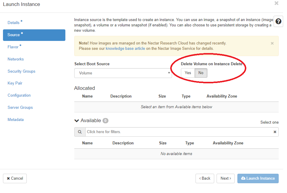 When you launch a new instance and select either 'Volume' or 'Volume Snapshot' as Boot Source, a 'Delete Volume on Instance Delete' button will appear. The function of this button is to ensure whether you want to delete the volume after instance is deleted. The implication of this is that if you have data on the volume you may need to keep the volume even after the instance is deleted. You can tick yes if you don't want to keep the volume. The default option is to keep the volume after instance deleted.